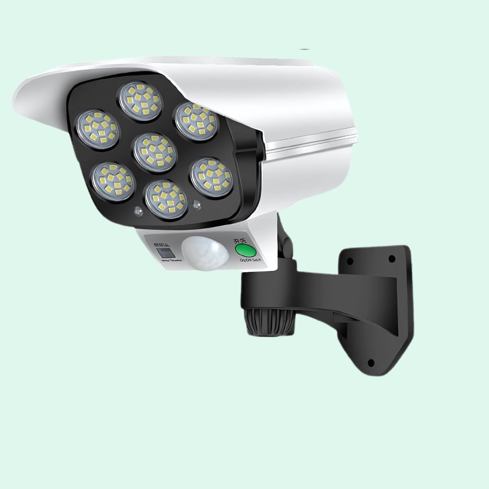 Notre projecteur solaire arbore un design unique qui évoque l'apparence d'une caméra de surveillance à distance, notamment grâce à son voyant rouge qui clignote.